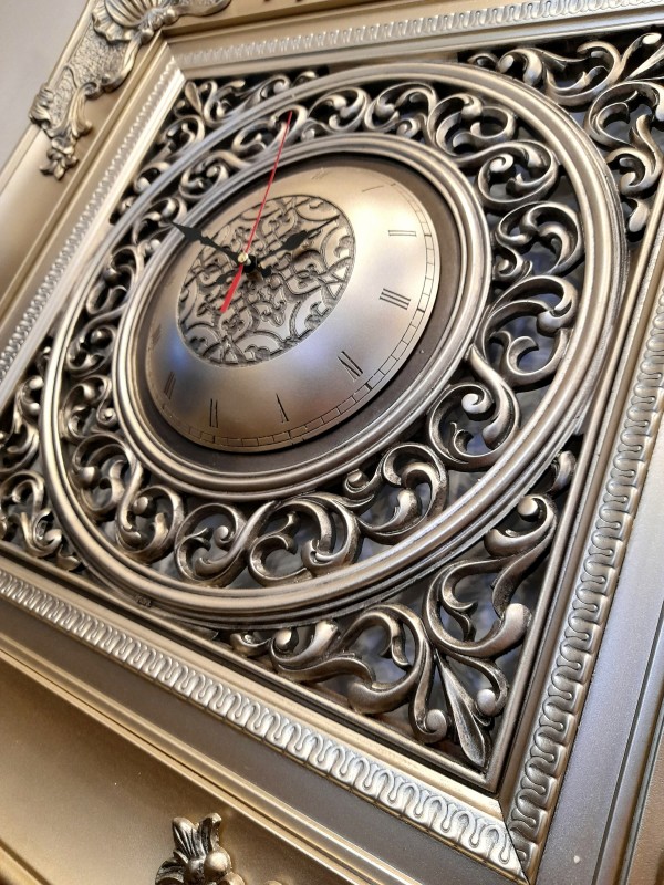 3D Sculpture Wall clock is made of polyresin coated with metallic colours, hand coated The frame is natural wood reinforced with PS letters treated to obtain the highest level of finishing and protection from weather factors