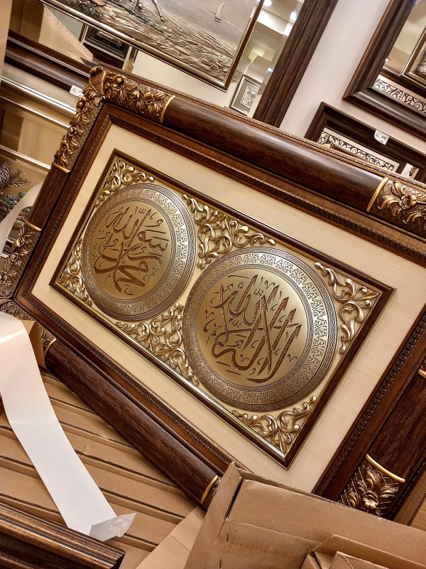 Classic 3D Sculpture Islamic Art Tableau - luxury frame - dual plate ( No God except Allah - Muhammad is the Messenger of Allah ) - medium - Brown