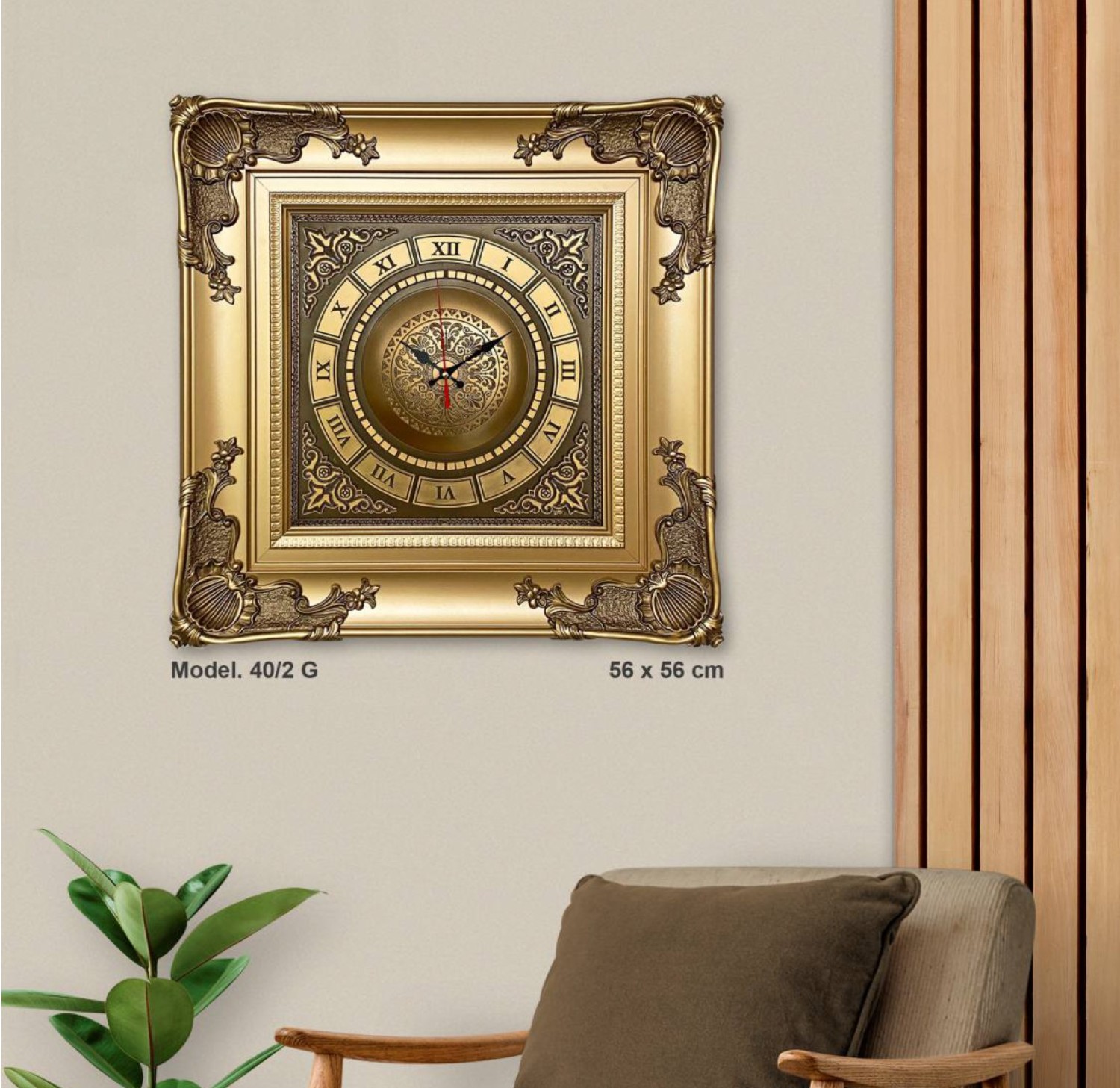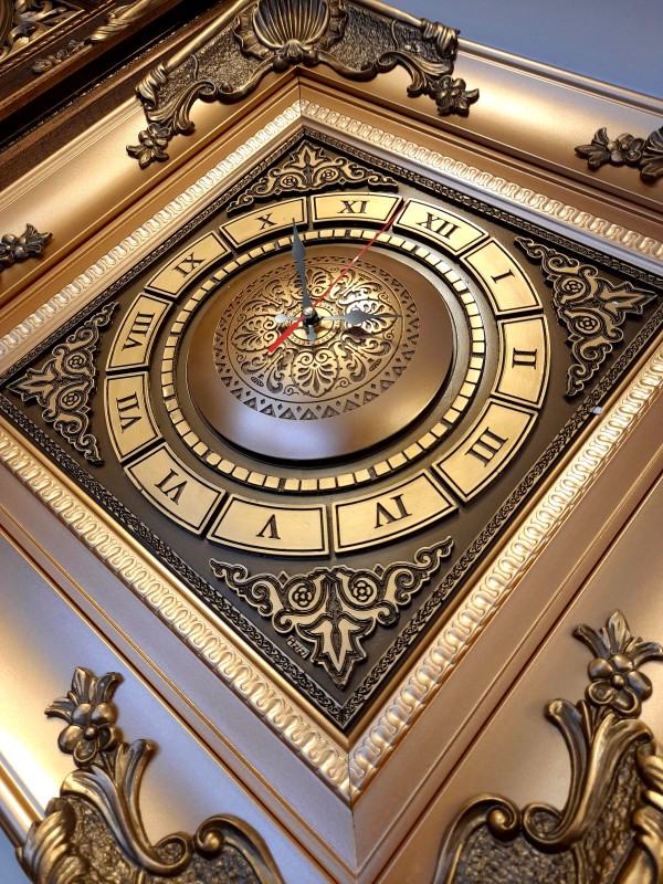 3D Sculpture Wall clock is made of polyresin coated with metallic colours, hand coated The frame is natural wood reinforced with PS letters treated to obtain the highest level of finishing and protection from weather factors